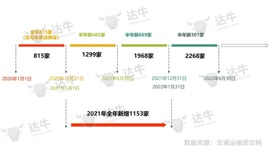 2022年1月18日交通运输部发布,截止2021年12月31日,全国共有网络货运1968家网络货运企业(含分公司),整合社会零散运力360万辆、驾驶员390万人,全年完成运单量6912万单,是2020年的3.9倍。