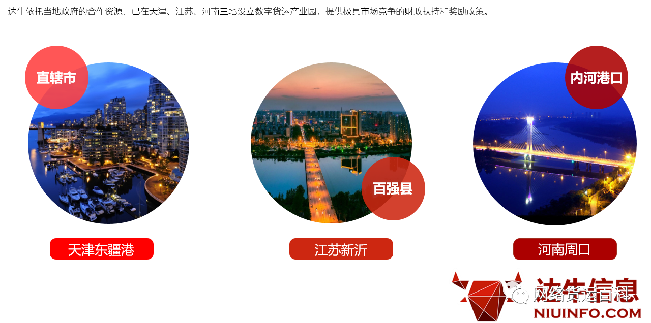 达牛数字货运产业园,为网络货运企业提供从注册登记、资质申办、政策扶持等服务,同时聚合优质业态资源和物流金融服务机构,构建完善产业生态,为企业及地区产业的持续发展奠定良好基础。目前达牛已经在天津东疆港、江苏新沂、河南周口设立数字货运产业园。三个地区在经济发展潜力、区位优势、产业发展都具备相当市场的竞争力。