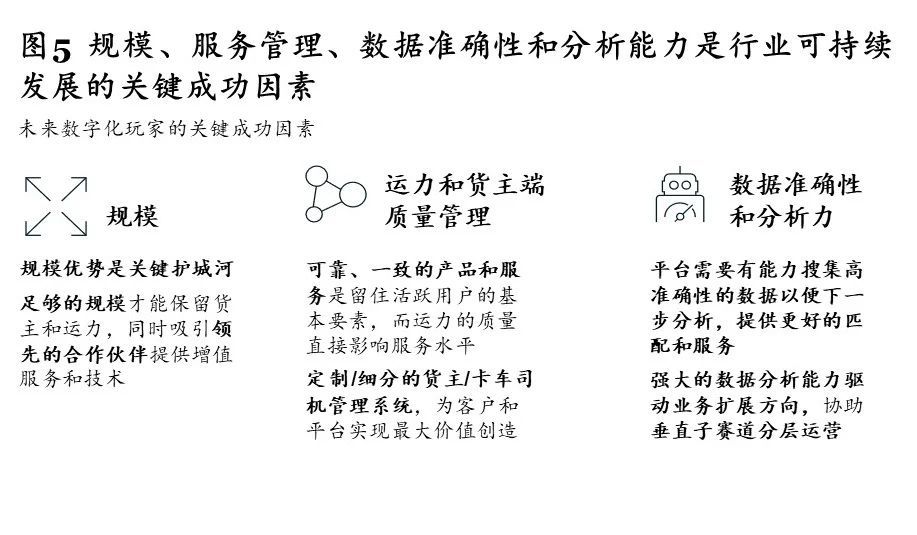 “通过互联网、平台的模式,或许可以改变目前行业内卷的现状。”专家在采访时表示,网络货运加速了我国物流行业智能化、数字化进程,代表着公路运输业进入了一种数字化发展、数字化管控、数字化升级的状态。数字化具有减少沟通成本、提高协作效率的作用。“在所有的产业互联网中,唯一已经完成顶层设计的就是网络货运。”同时表示,网络货运创造价值的方式是数字化支撑的运力供应链,至少有一个最小的单元,即人去控制这个车,才能产生劳动,才是一个运力。但是这样一个最基础的单元又很有必要通过各个链条、各种链条和物流需求对接,构成运力供应链。物流行业的B2B模式,这是一种供应链交易模式,在网络货运下,就应当用数字化的方式重新构建。作为平台的目标,就是既要降本增效,又要实现行业公平和产业人的幸福。网络货运平台虽然能很好地解决了即时匹配市场的陌生车中介问题。但是对于熟车、合同车,目前依然无法非常有效地组织管理。熟车和合同车对于货主的核心价值在于整体服务,以及对于运力的信任、掌控。例如有着稳定运力需求的公司企业,或者对运输服务的时效性、安全性等有着较高要求的货主。因此,网络货运平台除了信息匹配外,更需要逐步增强司机服务质量的管控,从而增加切入熟车、合同车市场的可能性,例如建立司机实名、评分等信用体系,通过更强的利益绑定、甚至雇佣关系掌握优质司机运力(类比滴滴专车)等手段。如果能提升服务质量,性价比明显更优,将帮助他们逐步获取货主的信任,从而撬动熟车市场,同时获取更加高端高价值的运输需求。网络货运平台在公路运输产业的价值不仅仅是只解决运输的问题,还有待解决的是运输相关联系统性问题,虽然行业暂时出现内卷,网络货运平台更需要在比较长时间里打磨运营及商业模式。第一,规模是护城河。未来国内外的公路运输数字化平台会进一步整合,以实现效率最大化。领先平台玩家在建立规模的护城河和提供优质服务的基础上寻求变现。整车市场数字化起步早,行业已经历过整合,随着规模效益带来的竞争壁垒日益牢固,领先者将重心从规模培育转向变现。第二,以强大的服务管理维持平台优势并改进和延伸。网络货运平台从业者意识到纯平台模式并非万能,在特定市场细分内,都需要应对传统线下模式的挑战。例如货拉拉推出企业版,开始尝试切入合同运力市场,寻找企业客户签订用车合约;满帮开始通过司机管控体系,分级司机,增强对服务质量的抓手,图谋进军新细分市场。第三,车、货数据能力(如信息准确度的提升)是数字化玩家和平台公司相较于传统业态的另一个核心区分点和优势。数据和规模优势可以帮助业务升级和延伸。例如随着货运订单数据的完善和积累,领先的公司通过线上匹配将可能获得精确的货运流向和规律,洞察货物的种类、尺寸、重量等信息。已经有平台开始尝试利用这些信息,搭配高效的算法,进行线上零担拼车, 颠覆传统重资产经营的零担行业。