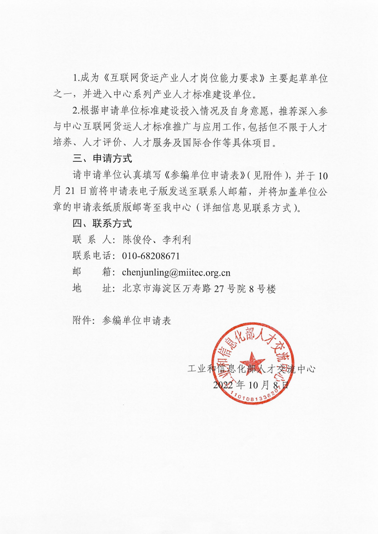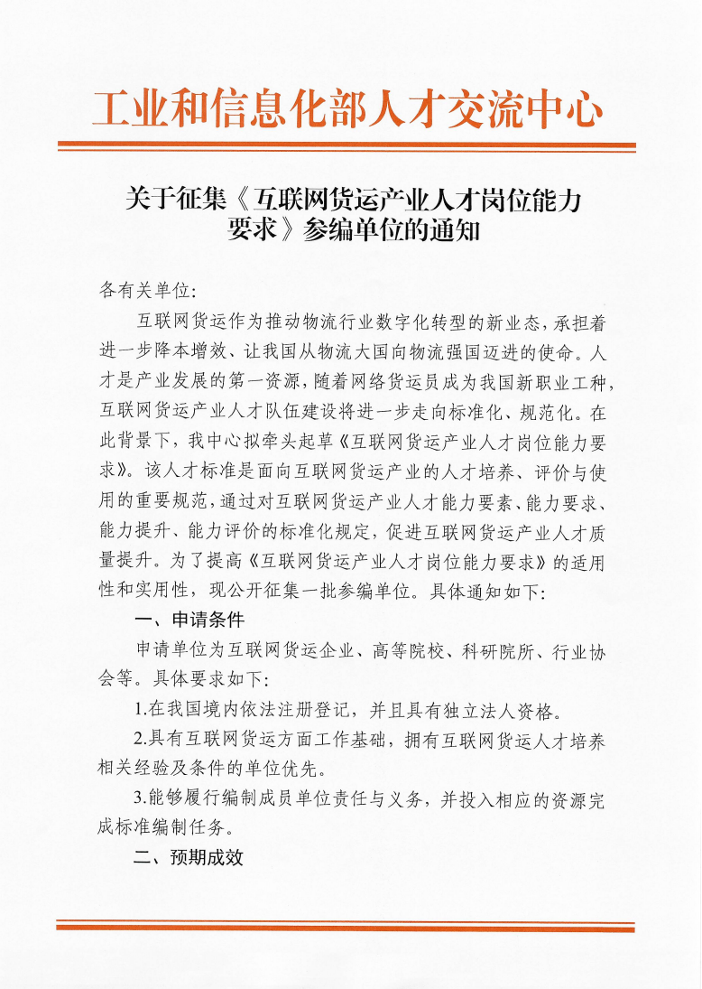 2022年9月28日,人力资源和社会保障部发布《中华人民共和国职业分类大典(2022年版)》,网络货运员(职业编号:4-02-02-04-003)成为新职业工种。随着我国居民消费支出增长和电商迅猛发展,道路货运凭借其灵活、便利、快捷的优势在综合运输体系中的重要作用日益凸显。2020年1月1日,交通运输部、国家税务总局发布的《网络平台道路货物运输经营管理暂行办法》(以下简称《办法》)正式实施,标志着我国网络货运行业步入全新发展阶段,推动了道路货运数字化发展进程。2020 年 1 月 1 日起正式开展“网络货运”道路运输经营许可至今,全国共有近2000家网络货运平台企业获得许可,现有整个行业的从业人员规模超过60万人。未来3年,网络货运平台企业将超过3000家,整个行业从事网络货运业务的从业人员规模预计可超过100万人。互联网货运作为推动物流行业数字化转型的新业态,人才是产业发展的第一资源,随着网络货运员成为我国新职业工种,互联网货运产业人才队伍建设将进一步走向标准化、规范化。在此背景下,《互联网货运产业人才岗位能力要求》参编单位征集正式启动!工业和信息化部人才交流中心公开征集相关新职业会遴选标准开发单位,标准的开发颁布和配套培训课程建设将有力推进网络货运员人才队伍建设,现公开征集一批参编单位。