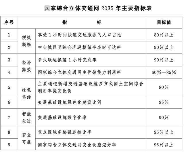 (三)发展目标到2035年,基本建成便捷顺畅、经济高效、绿色集约、智能先进、安全可靠的现代化高质量国家综合立体交通网,实现国际国内互联互通、全国主要城市立体畅达、县级节点有效覆盖,有力支撑“全国123出行交通圈”(都市区1小时通勤、城市群2小时通达、全国主要城市3小时覆盖)和“全球123快货物流圈”(国内1天送达、周边国家2天送达、全球主要城市3天送达)。交通基础设施质量、智能化与绿色化水平居世界前列。交通运输全面适应人民日益增长的美好生活需要,有力保障国家安全,支撑我国基本实现社会主义现代化。