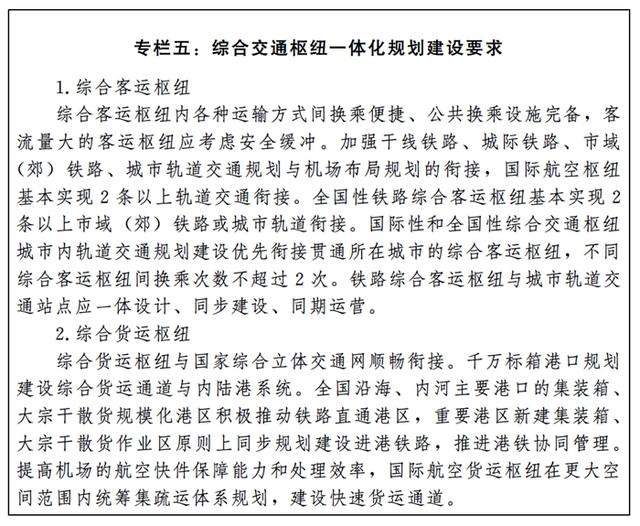 (四)推进交通与相关产业融合发展推进交通与邮政快递融合发展。推动在铁路、机场、城市轨道等交通场站建设邮政快递专用处理场所、运输通道、装卸设施。在重要交通枢纽实现邮件快件集中安检、集中上机(车),发展航空、铁路、水运快递专用运载设施设备。推动不同运输方式之间邮件快件装卸标准、跟踪数据等有效衔接,实现信息共享。发展航空快递、高铁快递,推动邮件快件多式联运,实现跨领域、跨区域和跨运输方式顺畅衔接,推进全程运输透明化。推进乡村邮政快递网点、综合服务站、汽车站等设施资源整合共享。推进交通与现代物流融合发展。加强现代物流体系建设,优化国家物流大通道和枢纽布局,加强国家物流枢纽应急、冷链、分拣处理等功能区建设,完善与口岸衔接,畅通物流大通道与城市配送网络交通线网连接,提高干支衔接能力和转运分拨效率。加快构建农村物流基础设施骨干网络和末端网络。发展高铁快运,推动双层集装箱铁路运输发展。