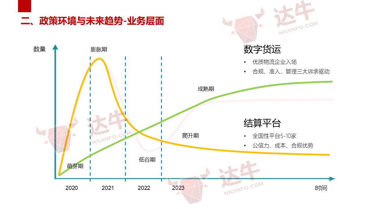 抛开网络货运,一种新的技术,新的产品、政策推广向市场,发展轨迹基本都是有迹可循的。按商业发展规律通俗地说就是初始启动期、井喷发展期、成熟期。达牛董事长杨少梁于2020年底,结合Gartner技术成熟度曲线对行业发展预测(见上图)大概为:2020年前的萌发期,2020-2021年膨胀期、2021-2022年低谷期,2023年进入成熟期常态化发展。今天是2022年7月22日,回看网络货运技术成熟度曲线,基本不需要校正。