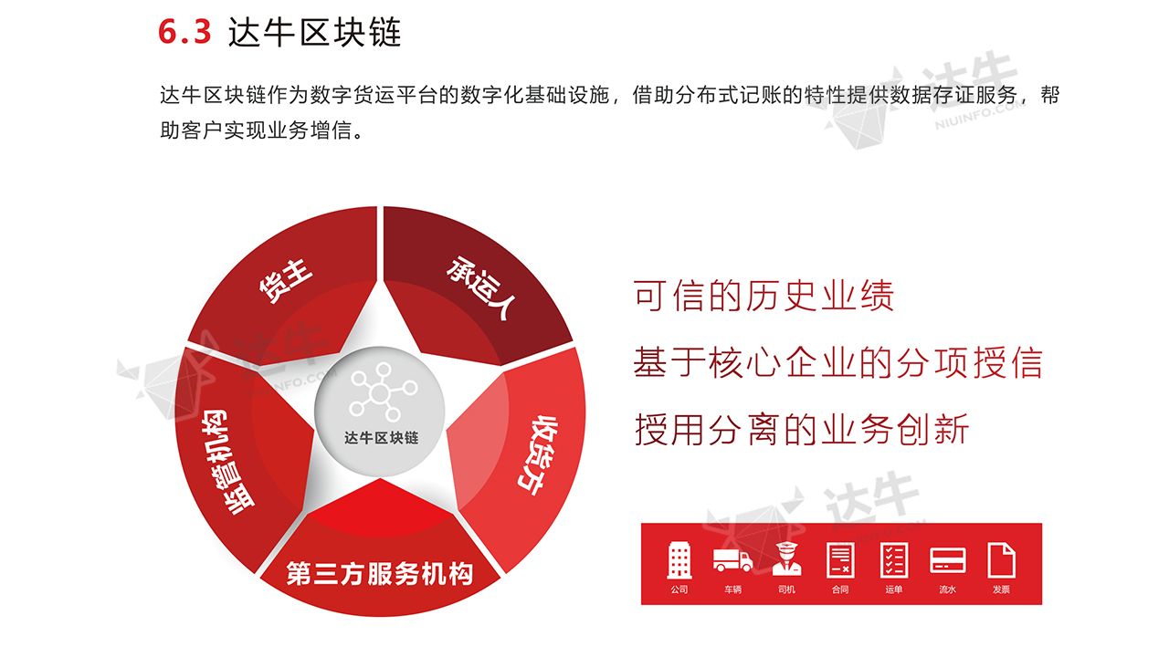 达牛的解决方案是网络货运平台+物流区块链+智能风控系统。区块链的五大特征分别是分布对等、链式数据块、防伪和联篡改、透明可信、高可靠性。达牛区块链作为网络货运平台的数字化基础设施,借助分布式记账的特性提供数据存证服务,帮助客户实现业务增信。