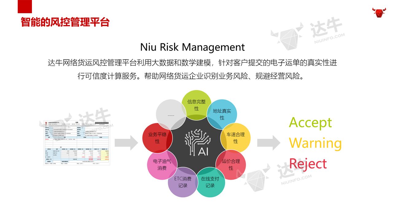 智能风控管理平台利用大数据和数学建模,针对客户提交的电子运单的真实性进行可信度计算服务,并进行运单的自动审核。可信度计算从信息完整性,地址真实性、车速合理性、运价合理性、在线支付记录、ETC消费记录、电子油气消费、业务平稳性等等维度,充分保证对数据的判断与验证。