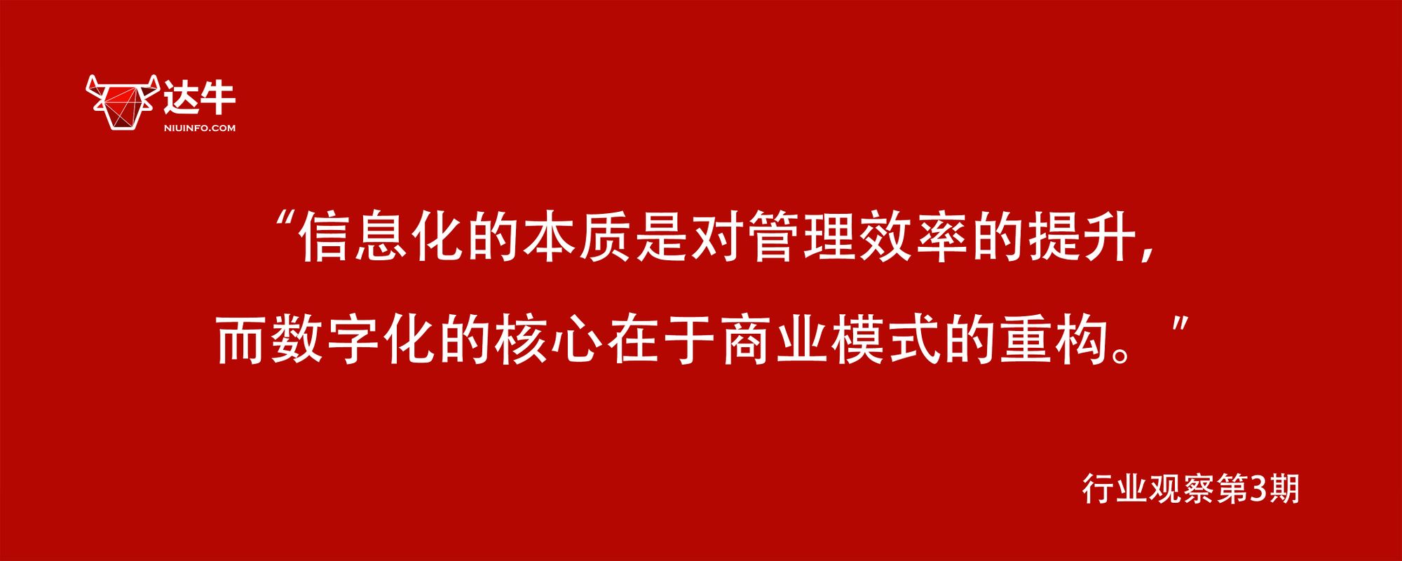首先信息化的本质是对管理效率的提升,而数字化的核心在于商业模式的重构。以下引用达牛董事长杨少梁在《如何区分数字化与信息化?》里的观点“信息化的目标是为了实现信息的对称,核心依然聚焦在信息本身。典型的信息化案例,办公自动化系统OA,所实现的是组织内部的部门与部门之间,员工与员工之间的内部协同与协作,通过信息的流动来实现工作效率与管理水平的提升。另一个案例是财务管理软件,使用了财务管理软件之后,财务管理工作的效率、准确性、正确性都有了很大的提升。不管是办公自动化系统还是财务管理系统,都是信息化的应用实践,都实现了效率的提升,但并未改变企业的经营逻辑,也就是说信息化应用的实践并没有对企业上下游的伙伴关系产生实质性的改变。