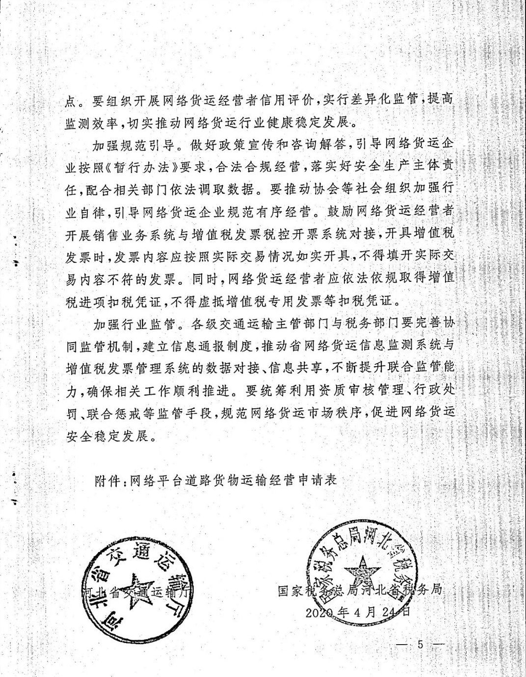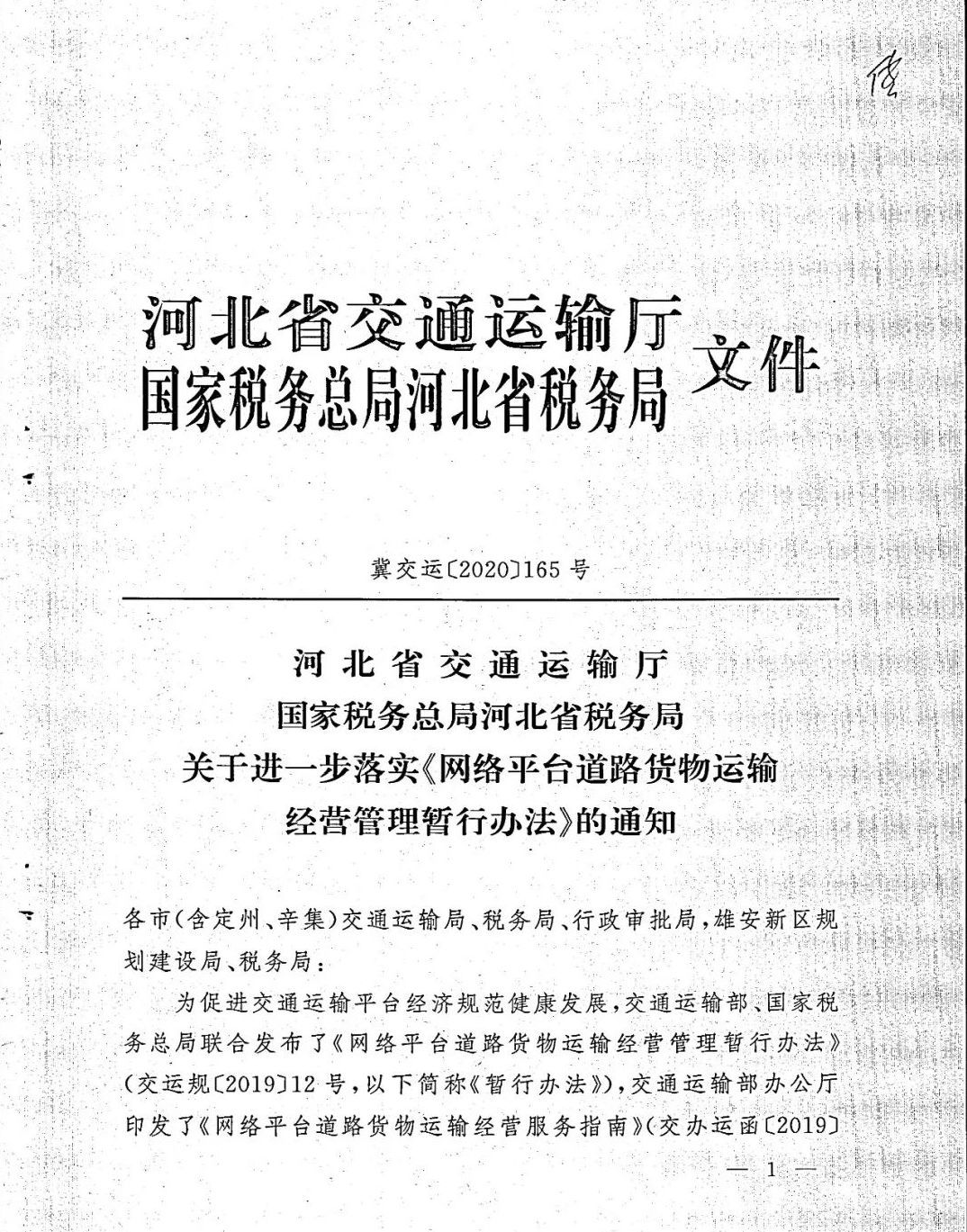 29 April 2020 / 政策法规 河北关于落实网络货运管理暂行办法的通知 河北省交通厅、国家税务总局河北省税务局联合发布了《关于进一步落实<网络平台道路货物运输经营管理暂行办法>的通知 》,对做好网络货运管理工作提出相关要求。具体通知内容如下: