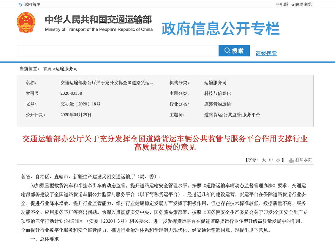 为加强重型载货汽车和半挂牵引车的动态监管,提升道路运输安全管理水平,按照《道路运输车辆动态监督管理办法》要求,交通运输部部署建设了全国道路货运车辆公共监管与服务平台(以下简称货运平台)。经过近几年的建设运营,货运平台在保障道路货运行业安全、促进行业降本增效、提升行业监管能力、维护行业健康稳定发展方面发挥了积极作用,但也存在技术标准较低、数据质量不高、服务功能不全、应用服务不广等突出问题。为深入贯彻落实党中央、国务院决策部署,按照《国务院安全生产委员会关于印发〈全国安全生产专项整治三年行动计划〉的通知》(安委〔2020〕3号)相关要求,进一步发挥货运平台在促进道路货运行业转型升级高质量发展中的作用,全面提升行业数字化服务和安全监管能力,推进行业治理体系和治理能力现代化,经交通运输部同意,现提出以下意见。