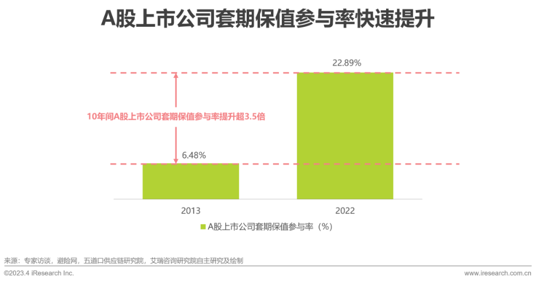 大宗商品市场价格波动显著,风险敞口数额巨大,使用金融衍生工具进行套期保值是大宗商品企业对冲风险敞口、管理经营风险的有效方式。但是大宗商品衍生品在企业中的应用还存在两大方面的问题,一是许多企业尤其是中小企业对于套期保值的认知较低,缺乏利用衍生品进行风险管理的意识;二是部分企业在套期保值时因操作不当转为投机行为而产生巨大亏损 。与大宗商品风控负面事件频发相对应的,是目前国内市场对于套期保值参与度的提升,A股上市公司套期保值参与率由2013年的6.48%飙升至2022年的22.89%,能力的缺失与需求的提升将共同推动整个行业对于专业化风险管理IT服务的需求。