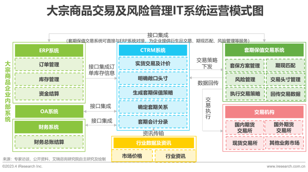 大宗商品贸易模式的革新及定价方式与计算逻辑复杂度的提升,对于大宗商品企业风险敞口管理、计价、估值及现金流测算等方面的业务能力提出了更高的要求,传统的“Excel+人工”的方式无法满足大宗商品企业对于业务流程把控与风险管理的需求。此外,伴随着国内大宗商品衍生品市场的发展,大宗商品企业的IT系统建设也从最初的“业务流程线上化”,逐步发展为企业对于完整大宗商品风控解决方案的需求。完整的风控解决方案是将大宗商品现货市场与期货市场相结合,通过CTRM系统与套期保值交易系统的搭建,实现对于大宗商品企业全面的风险管理。企业对于IT系统能力要求的提升与系统建设需求的迭代,成为驱动国内大宗商品交易及风控IT服务行业发展的核心因素之一。
