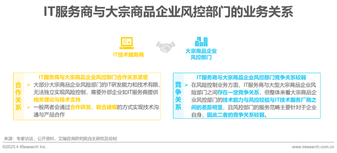 在营销拓客方面,目前整个国内大宗商品IT服务行业仍处于发展的初期阶段,对于软件产品的营销方式也处于探索期,除了传统的直销方式外,IT服务厂商根据自身企业情况与对行业发展的理解纷纷采用了各具特色的营销方式。其中,与同产业链关联参与方共建生态的方式被认为是实现针对营销、充分挖掘客户需求、低成本高效率且利于行业整体发展的卓越营销方式,其核心是IT服务厂商通过为期货公司提供简易版平台系统的方式,借由期货公司向潜在用户宣传、推荐自家软件系统,以实现对于挖掘用户需求与用户使用习惯的培养。在业务的合作方面,由于技术能力与风控经验的差距,大宗商品企业风控部门与厂商间多以合作关系为主。