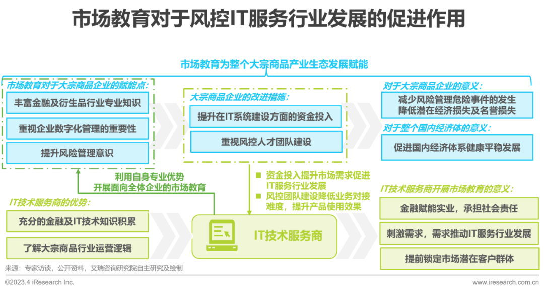 大宗商品企业没有足够强的风险管理意识不仅意味着其自身将面临较大的经营风险,同时也是对整个国内经济体系平稳运行的重大威胁。IT技术服务厂商作为拥有金融衍生品知识、了解大宗商品运营逻辑的核心市场参与者,应积极开展面向全体大宗商品企业的市场教育工作,承担金融赋能实业的社会责任。此外,市场教育在促使大宗商品企业重视风控能力的同时,也将提升其在风控IT系统建设方面的资金投入,最终IT厂商开展的市场教育工作在为整个大宗商品产业生态赋能后,又通过市场供需关系的相互作用,进一步推动了整个IT技术服务行业的发展。