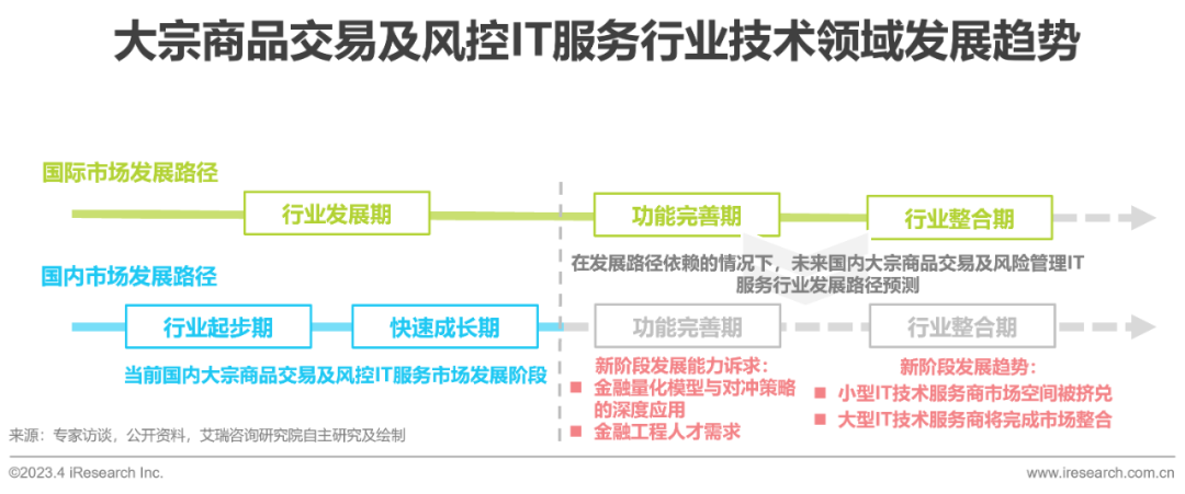 从行业发展与技术应用的角度来看,国内大宗商品交易及风险管理IT服务行业目前处于信息化发展阶段,当前阶段服务的核心内容是帮助大宗商品企业完成线下业务线上化、信息化部署。考虑到IT服务行业市场发展具有一定的路径依赖性,参考国际大宗商品交易及风控IT服务行业的发展规律,未来推动国内市场步入数字化行业发展新阶段的关键是IT服务厂商对于金融量化模型更全面、深刻的应用。通过吸收金融领域的量化模型与对冲逻辑,帮助大宗商品风控IT技术服务商提升市场风险管理能力,推动整个国内市场进入风控IT系统的功能完善期。市场的全新发展阶段为IT厂商的技术架构、团队建设等方面提出了全新诉求,国内市场普遍的以ERP为架构基础的风控系统及了解大宗商品业务的技术人才将难以满足国内市场发展新阶段的需求,将金融模型、大数据与大宗商品风控融合更全面的风控系统及了解大宗商品运营逻辑与金融知识的金工人才,才是IT服务厂商未来发展的核心竞争力。对于小型IT技术服务厂商来说,市场能力诉求的转变将提升其生存难度,同时小型IT技术厂商也难以满足市场对于完整一体化风控产品的需求,未来极有可能受到市场挤兑,逐步被市场淘汰。与此同时,国内大宗商品IT服务市场也将会出现类似于国际市场ION的大型IT技术服务商,收购整合市场内其他大宗商品风控IT技术服务厂商,进而推动整个国内市场步入更加成熟的行业整合阶段。