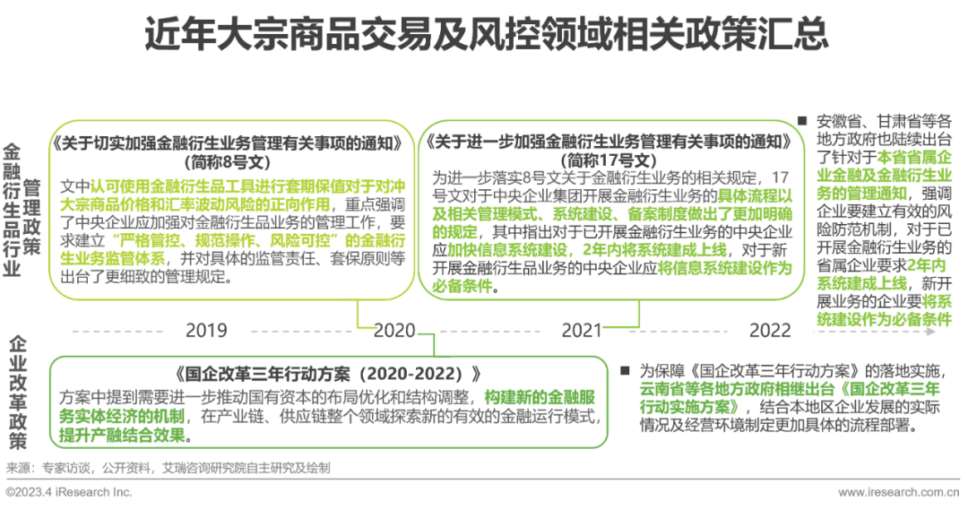 自2020年起,国家出台了两项关于规范金融衍生品业务管理及监管体系建设的通知,要求将信息系统建设作为开展金融衍生品业务的必备条件,对于已开展金融衍生业务的企业要求在两年内完成相关系统建设。与此同时,《国企改革三年行动方案》的出台强调企业要重视在金融服务机制方面的构建,提升整体产融结合效果。相关政策的出台全面提升了市场对于金融风控体系建设服务能力的需求,也成为推动近年国内大宗商品交易及风控IT行业发展的核心因素。此外,政策带来的影响力将远超其内容覆盖的范畴,预计未来几年,金融体系建设需求将从中央企业、省属企业逐步辐射至地方企业及民营企业,市场对于金融风控IT服务的需求将进一步推动该行业的发展。