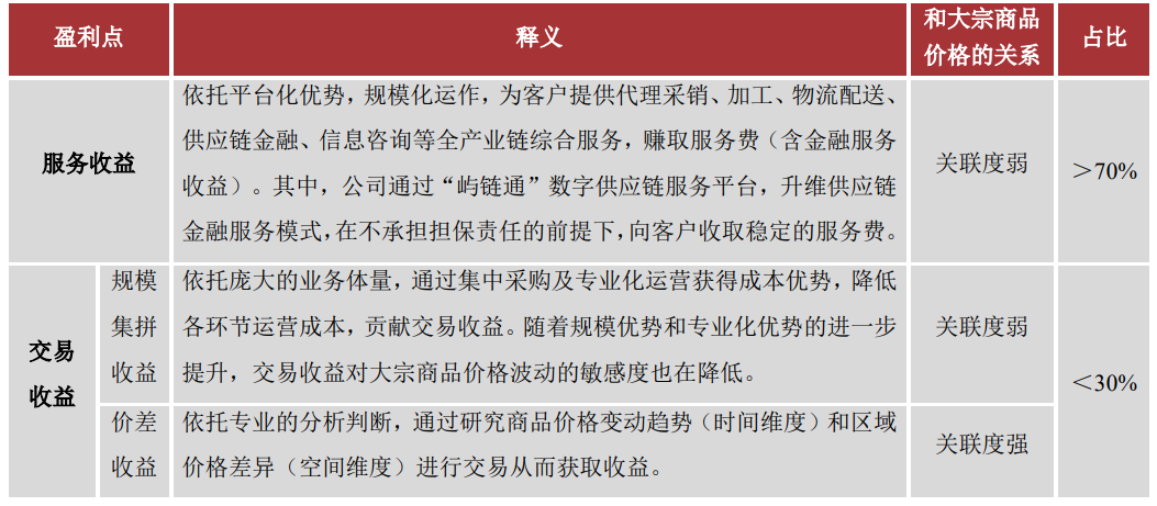 传统的贸易商主要依靠赚取价差来获取盈利,而大宗供应链公司的盈利来源主要包含服务收益、金融收益、交易收益。